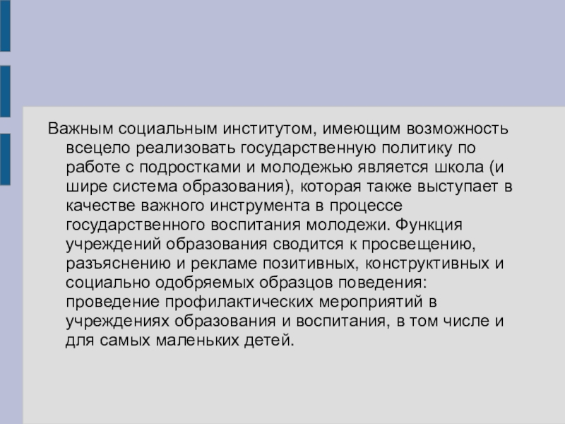 Слайд 8Важным социальным институтом, имеющим возможность всецело реализовать государственную политику по
