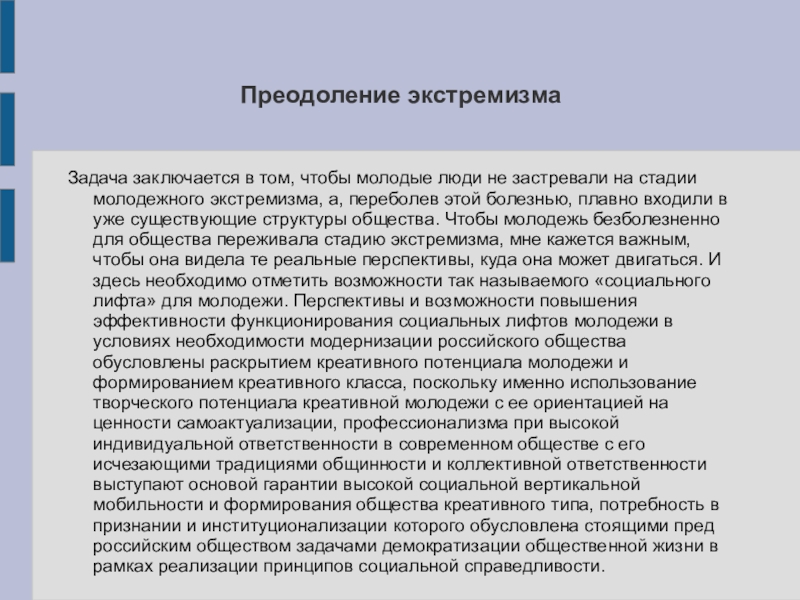 в уже существующие структуры общества. Чтобы молодежь безболезненно для общества переживала стадию экстремизма, мне кажется важным, чтобы она видела те реальные перспективы, куда она может двигаться. И здесь необходимо отметить возможности так называемого «социального лифта» для молодежи. Перспективы и возможности повышения эффективности функционирования социальных лифтов молодежи в условиях необходимости модернизации российского общества обусловлены раскрытием креативного потенциала молодежи и формированием креативного класса, поскольку именно использование творческого потенциала креативной молодежи с ее ориентацией на ценности самоактуализации, профессионализма при высокой индивидуальной ответственности в современном обществе с его исчезающими традициями общинности и коллективной ответственности выступают основой гарантии высокой социальной вертикальной мобильности и формирования общества креативного типа, потребность в признании и институционализации которого обусловлена стоящими пред российским обществом задачами демократизации общественной жизни в рамках реализации принципов социальной справедливости.