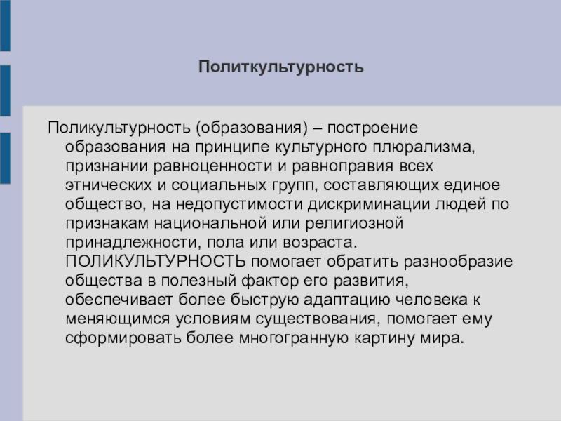 общество, на недопустимости дискриминации людей по признакам национальной или религиозной принадлежности, пола или возраста. ПОЛИКУЛЬТУРНОСТЬ помогает обратить разнообразие общества в полезный фактор его развития, обеспечивает более быструю адаптацию человека к меняющимся условиям существования, помогает ему сформировать более многогранную картину мира.