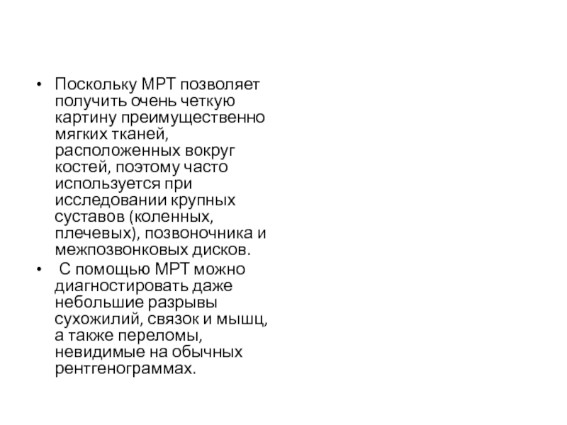 Слайд 8Поскольку МРТ позволяет получить очень четкую картину преимущественно мягких тканей,