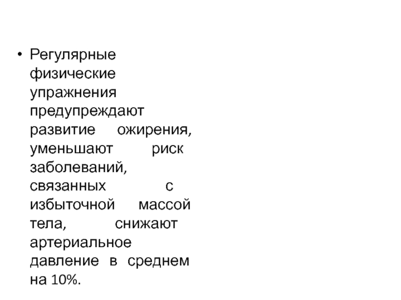 Слайд 9Регулярные физические упражнения предупреждают развитие ожирения, уменьшают риск заболеваний, связанных