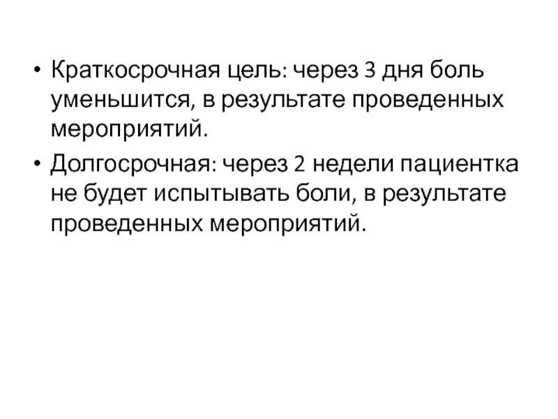 Слайд 12Краткосрочная цель: через 3 дня боль уменьшится, в результате проведенных