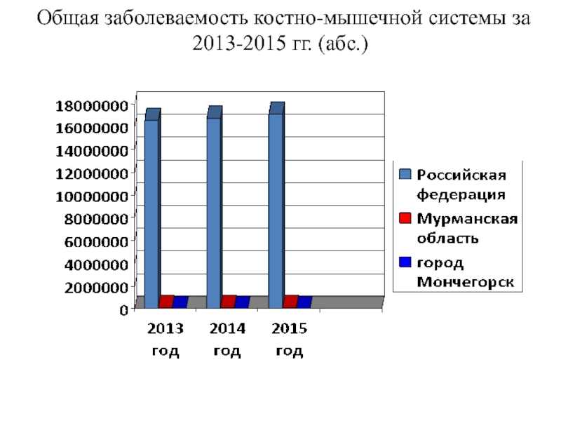 Слайд 4Общая заболеваемость костно-мышечной системы за 2013-2015 гг. (абс.)