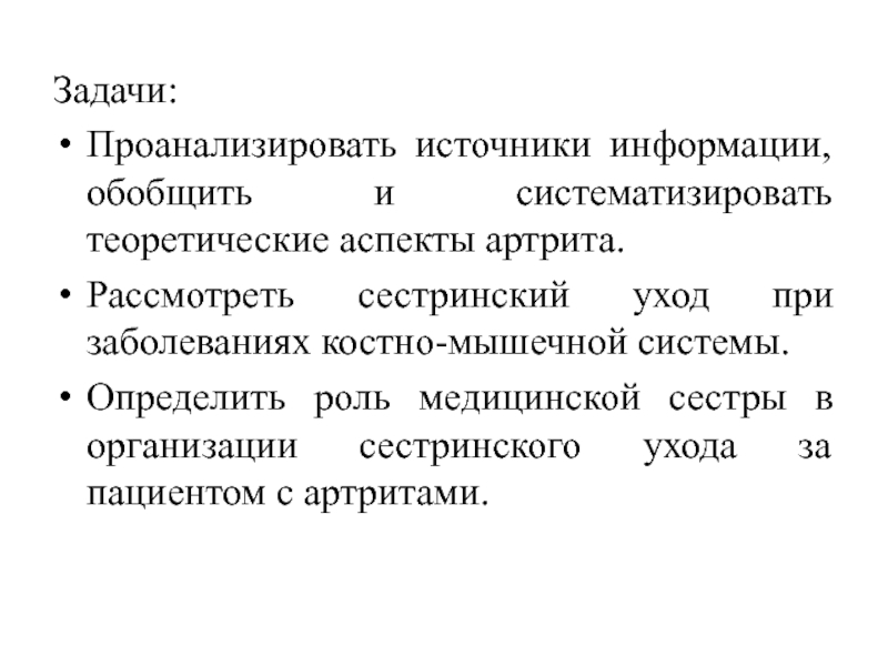 Проанализировать источники информации, обобщить и систематизировать теоретические аспекты артрита.