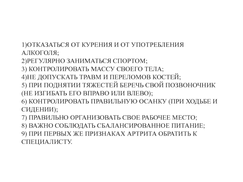 Слайд 141)Отказаться от курения и от употребления алкоголя;