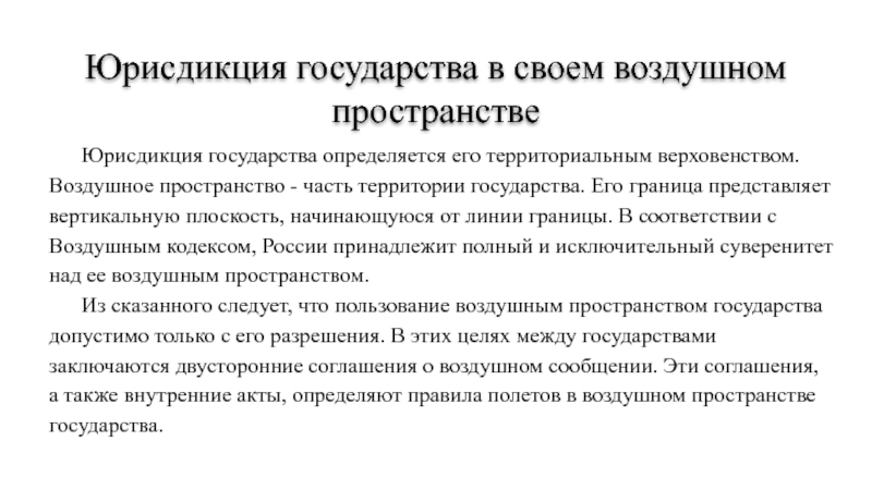 вертикальную плоскость, начинающуюся от линии границы. В соответствии с Воздушным кодексом, России принадлежит полный и исключительный суверенитет над ее воздушным пространством.