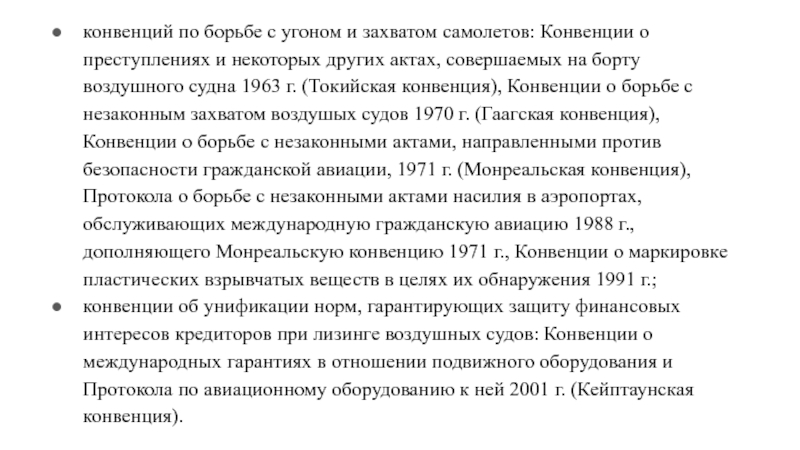 1963 г. (Токийская конвенция), Конвенции о борьбе с незаконным захватом воздушых судов 1970 г. (Гаагская конвенция), Конвенции о борьбе с незаконными актами, направленными против безопасности гражданской авиации, 1971 г. (Монреальская конвенция), Протокола о борьбе с незаконными актами насилия в аэропортах, обслуживающих международную гражданскую авиацию 1988 г., дополняющего Монреальскую конвенцию 1971 г., Конвенции о маркировке пластических взрывчатых веществ в целях их обнаружения 1991 г.;