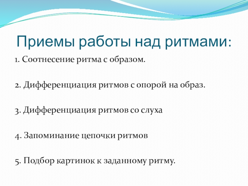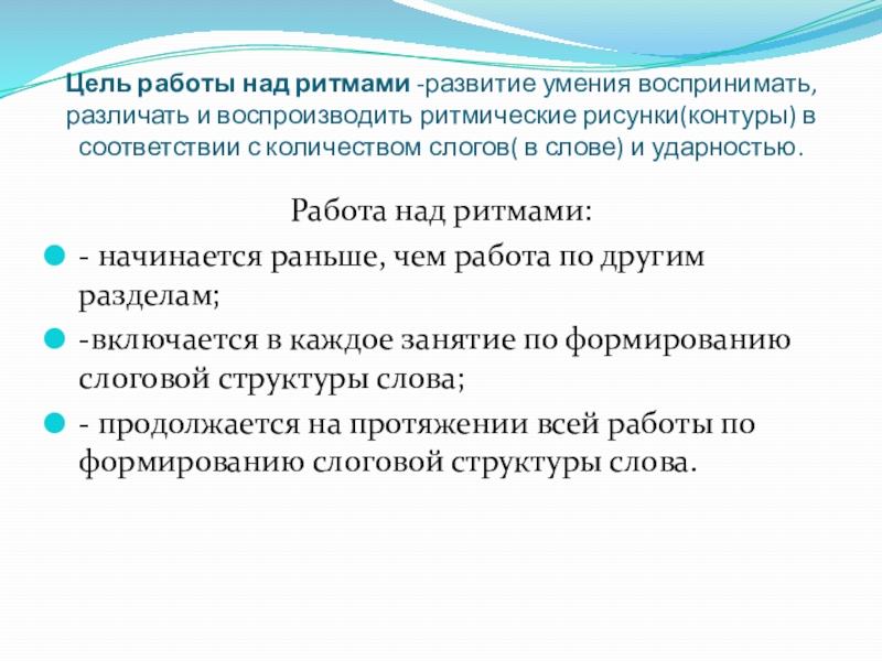 Слайд 3Цель работы над ритмами -развитие умения воспринимать, различать и воспроизводить