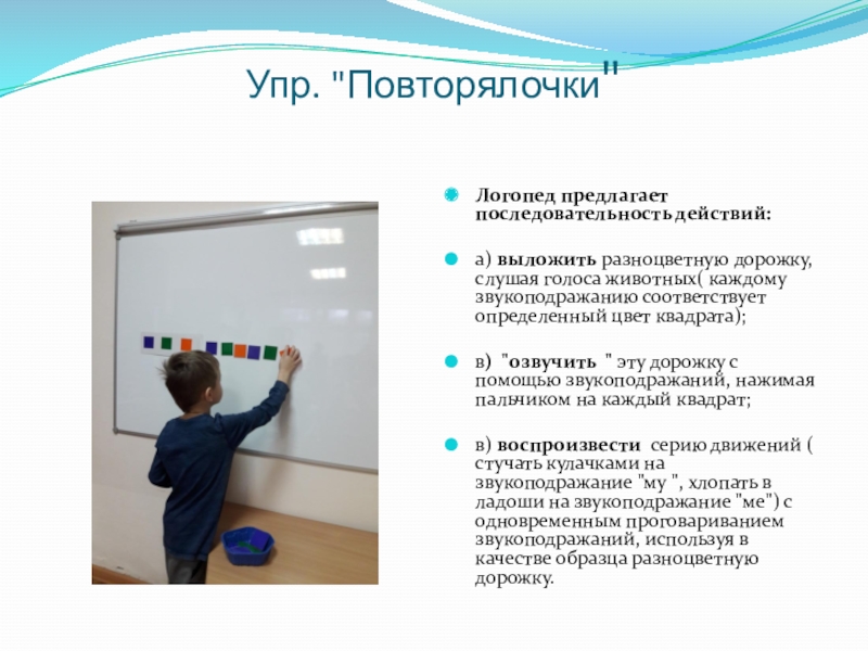 в) воспроизвести серию движений ( стучать кулачками на звукоподражание "му ", хлопать в ладоши на звукоподражание "ме") с одновременным проговариванием звукоподражаний, используя в качестве образца разноцветную дорожку.