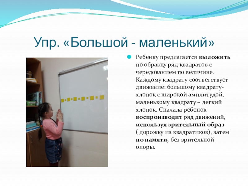 хлопок с широкой амплитудой, маленькому квадрату – легкий хлопок. Сначала ребенок воспроизводит ряд движений, используя зрительный образ ( дорожку из квадратиков), затем по памяти, без зрительной опоры.