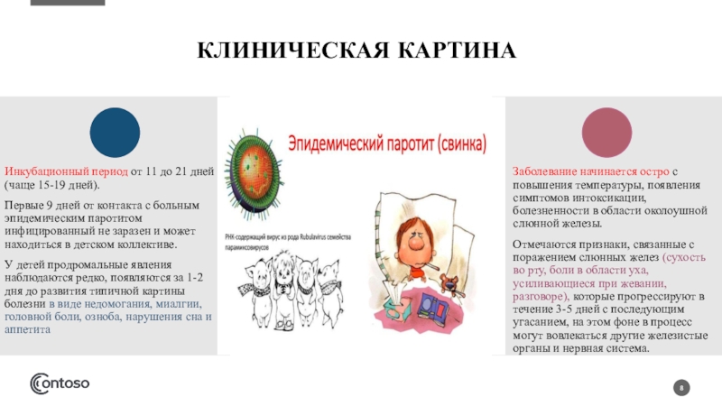 Отмечаются признаки, связанные с поражением слюнных желез (сухость во рту, боли в области уха, усиливающиеся при жевании, разговоре), которые прогрессируют в течение 3-5 дней с последующим угасанием, на этом фоне в процесс могут вовлекаться другие железистые органы и нервная система.