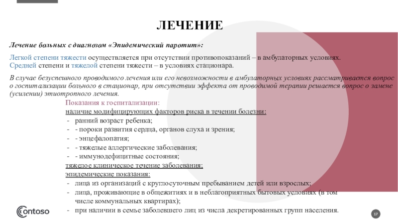 Больные тяжелыми клиническими формами эпидемического паротита (при подозрении на заболевание), а также больные из детских учреждений с постоянным пребыванием детей, общежитий, проживающие в неблагоприятных бытовых условиях должны быть госпитализированы в стационар. Дезинфекция в очагах инфекции не проводится.