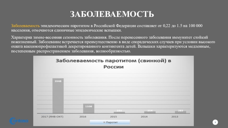 Восприимчивость всеобщая, чаще болеют дети от 1 года до 15 лет. Эпидемический паротит – типичная антропонозная инфекция, болеет только человек. Индекс контагиозности – 70-85%. Лица мужского пола болеют в 1,5 раза чаще, чем женского.