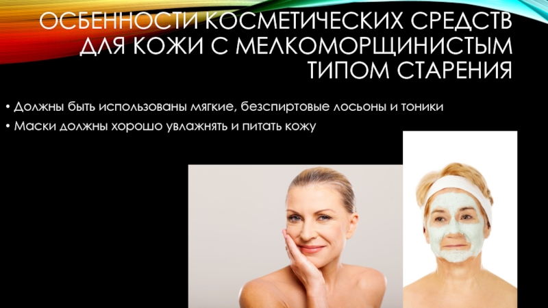 Слайд 14Осбенности косметических средств для кожи с мелкоморщинистым типом старения