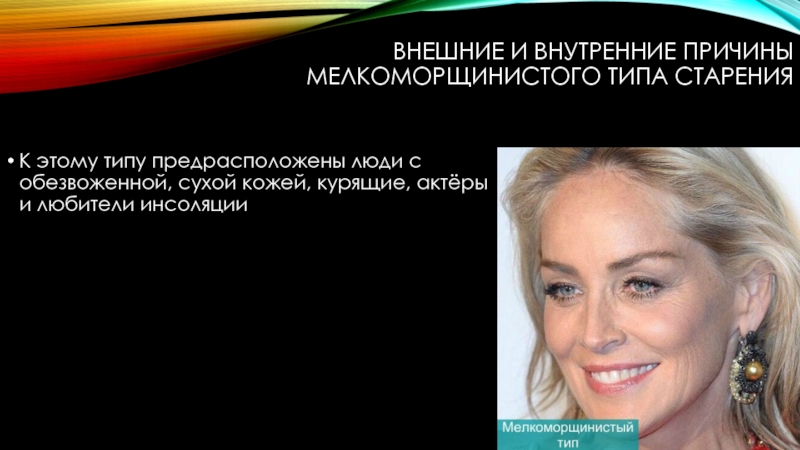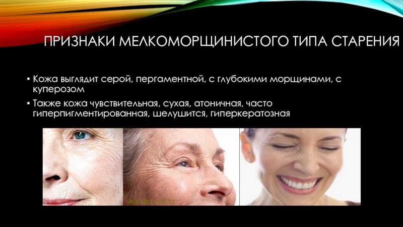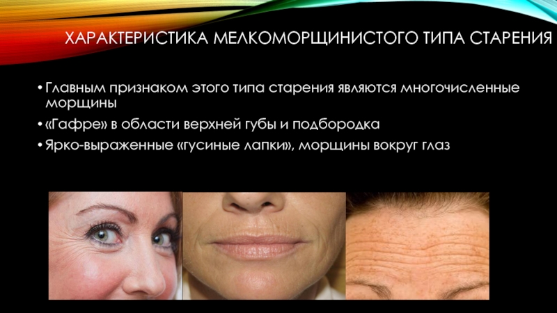 Слайд 6Мелкоморщинистый тип относится к раннему типу старения – признаки появляются