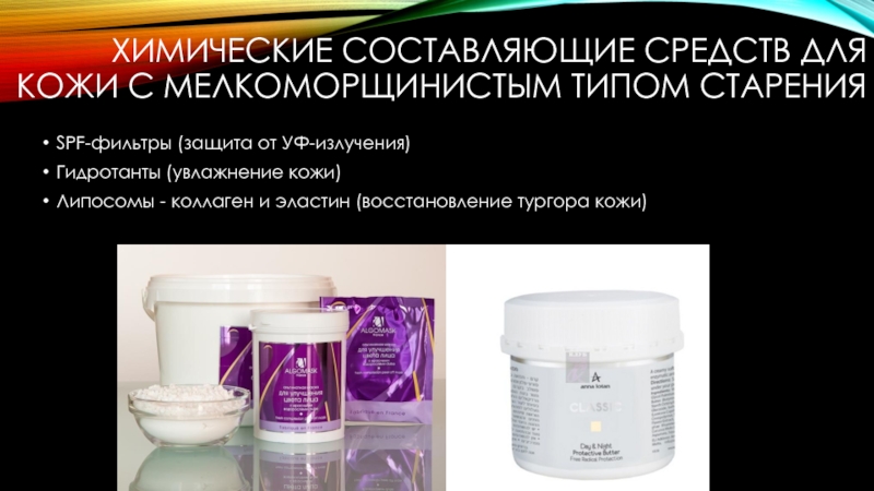 Слайд 16Химические составляющие средств для кожи с мелкоморщинистым типом старения