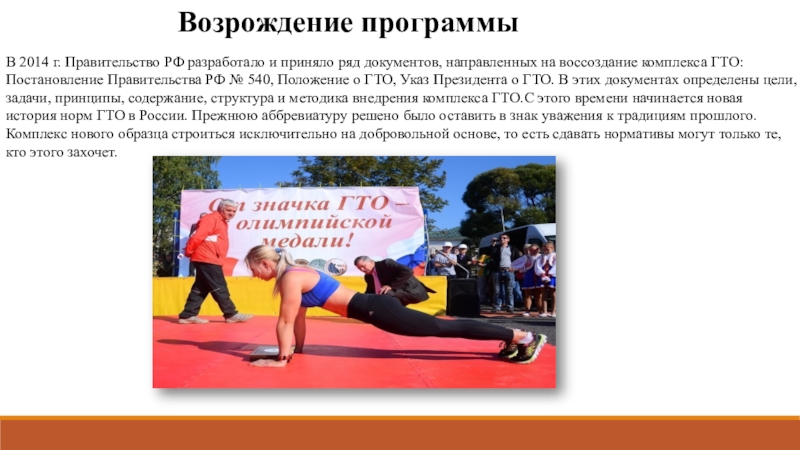 540, Положение о ГТО, Указ Президента о ГТО. В этих документах определены цели, задачи, принципы, содержание, структура и методика внедрения комплекса ГТО.С этого времени начинается новая история норм ГТО в России. Прежнюю аббревиатуру решено было оставить в знак уважения к традициям прошлого.