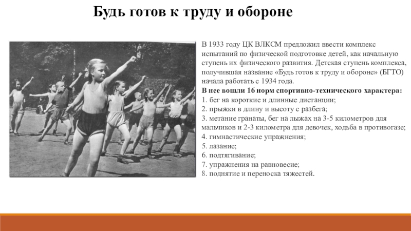 комплекса, получившая название «Будь готов к труду и обороне» (БГТО) начала работать с 1934 года.