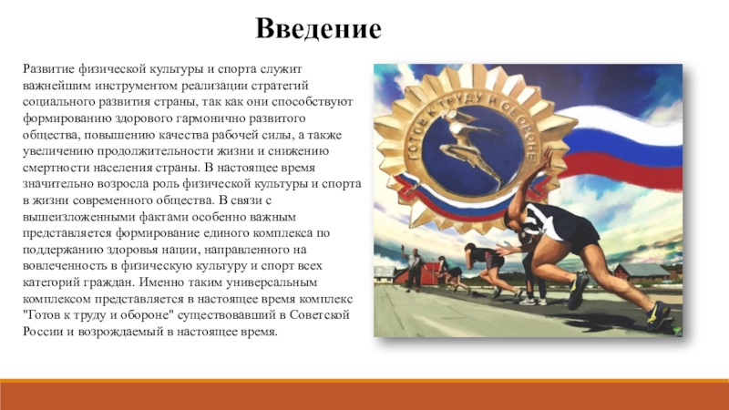 развитого общества, повышению качества рабочей силы, а также увеличению продолжительности жизни и снижению смертности населения страны. В настоящее время значительно возросла роль физической культуры и спорта в жизни современного общества. В связи с вышеизложенными фактами особенно важным представляется формирование единого комплекса по поддержанию здоровья нации, направленного на вовлеченность в физическую культуру и спорт всех категорий граждан. Именно таким универсальным комплексом представляется в настоящее время комплекс "Готов к труду и обороне" существовавший в Советской России и возрождаемый в настоящее время.