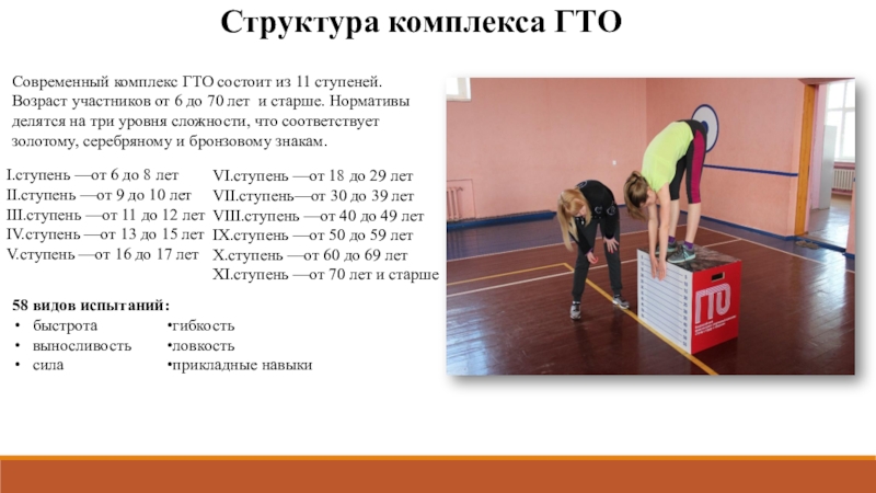 Современный комплекс ГТО состоит из 11 ступеней. Возраст