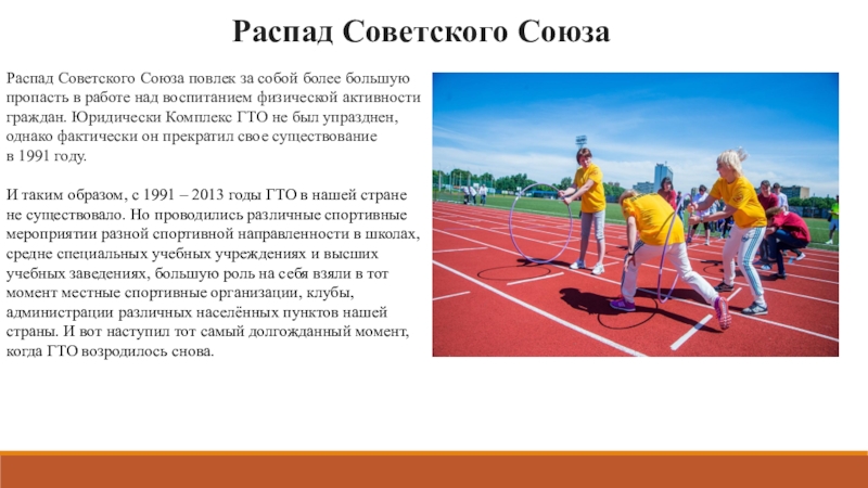И таким образом, с 1991 – 2013 годы ГTO в нашей стране не существовало. Нo проводились различные спортивные мероприятии разной спортивной направленности в школах, средне специальных учебных учреждениях и высших учебных заведениях, большую роль на себя взяли в тот момент местные спортивные организации, клубы, администрации различных населённых пунктов нашей страны. И вoт наступил тот самый долгожданный момент, когда ГТО возродилось снова.