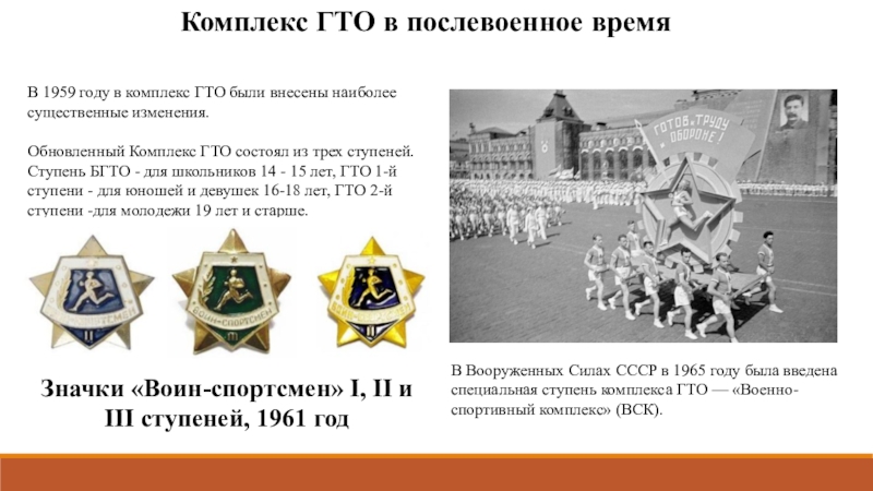 В Вооруженных Силах СССР в 1965 году была введена специальная ступень комплекса ГТО — «Военно-спортивный комплекс» (ВСК).