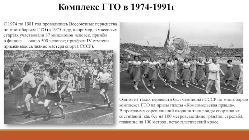 Одним из таких первенств был чемпионат СССР по многоборью комплекса ГТО на призы газеты «Комсомольская правда». В программу соревнований входили такие виды спортивных состязаний, как бег на 100 метров, метание гранаты, стрельба, плавание на 100 метров, легкоатлетический кросс.
