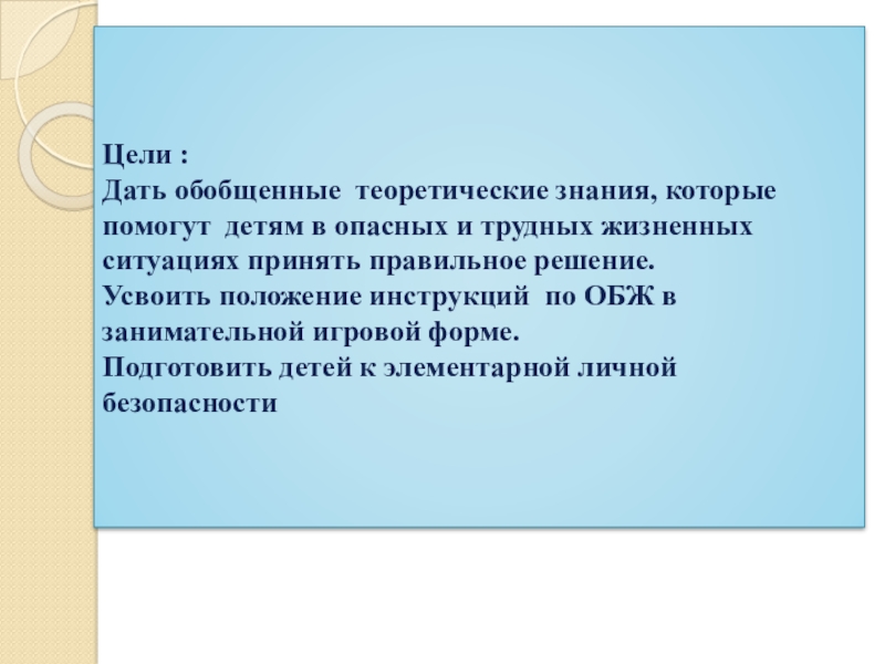 Дать обобщенные теоретические знания, которые помогут детям в опасных