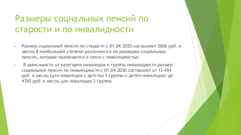 Слайд 62Размеры социальных пенсий по старости и по инвалидности