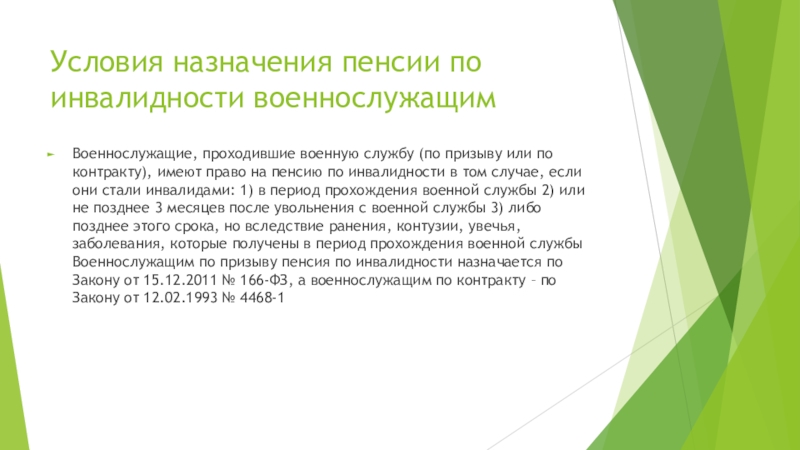 Слайд 13Условия назначения пенсии по инвалидности военнослужащим