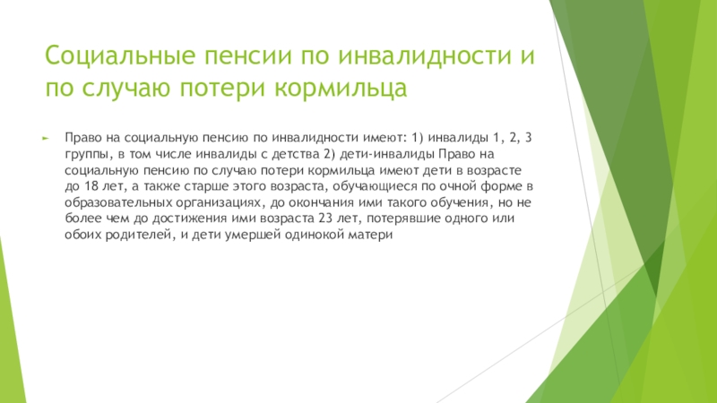 группы, в том числе инвалиды с детства 2) дети-инвалиды Право на социальную пенсию по случаю потери кормильца имеют дети в возрасте до 18 лет, а также старше этого возраста, обучающиеся по очной форме в образовательных организациях, до окончания ими такого обучения, но не более чем до достижения ими возраста 23 лет, потерявшие одного или обоих родителей, и дети умершей одинокой матери