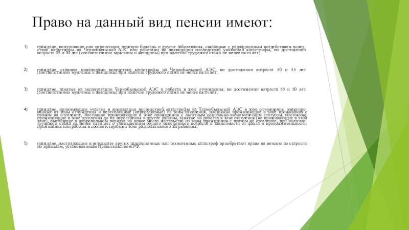 граждане, принимавшие участие в ликвидации последствий катастрофы на Чернобыльской АЭС в зоне отчуждения, эвакуированные из зоны отчуждения и переселенные (переселяемые) из зоны отселения, постоянно проживающие в зоне проживания с правом на отселение, постоянно проживающие в зоне проживания с льготным социально-экономическим статусом, постоянно проживающие в зоне отселения до их переселения в другие районы, занятые на работах в зоне отселения (не проживающие в этой зоне), выехавшие в добровольном порядке на новое место жительства из зоны проживания с правом на отселение, при наличии трудового стажа не менее пяти лет с уменьшением общего пенсионного возраста в зависимости от факта и продолжительности проживания или работы в соответствующей зоне радиоактивного загрязнения;