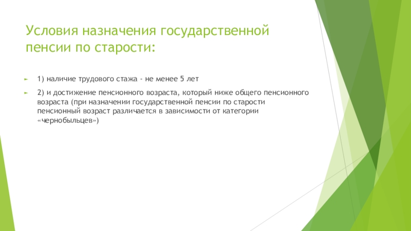 Слайд 7Условия назначения государственной пенсии по старости: