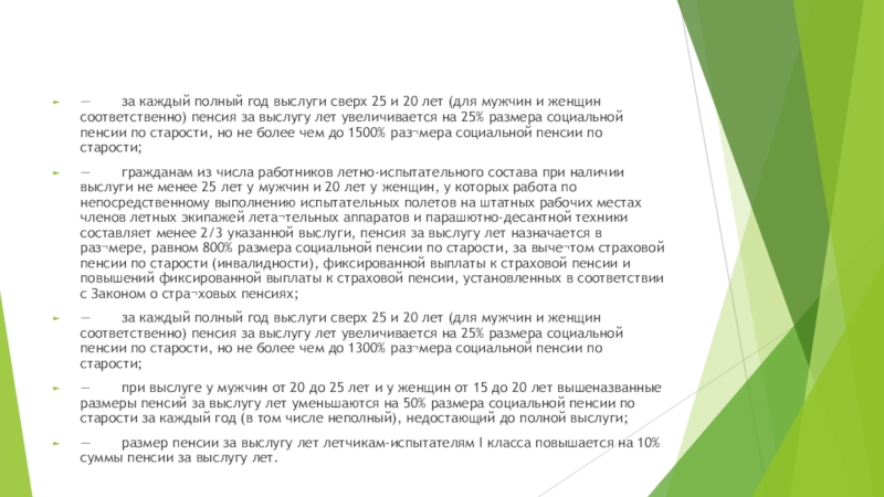 — гражданам из числа работников летно-испытательного состава при наличии выслуги не менее 25 лет у мужчин и 20 лет у женщин, у которых работа по непосредственному выполнению испытательных полетов на штатных рабочих местах членов летных экипажей лета¬тельных аппаратов и парашютно-десантной техники составляет менее 2/3 указанной выслуги, пенсия за выслугу лет назначается в раз¬мере, равном 800% размера социальной пенсии по старости, за выче¬том страховой пенсии по старости (инвалидности), фиксированной выплаты к страховой пенсии и повышений фиксированной выплаты к страховой пенсии, установленных в соответствии с Законом о стра¬ховых пенсиях;