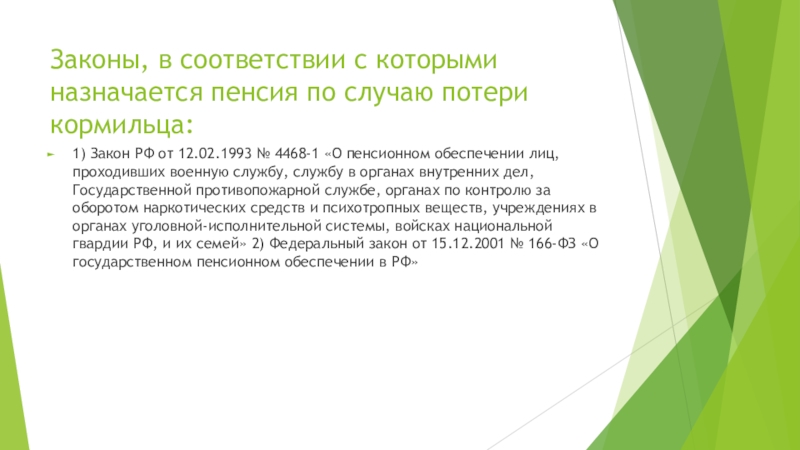 Слайд 20Законы, в соответствии с которыми назначается пенсия по случаю потери