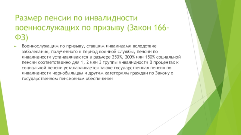 Слайд 16Размер пенсии по инвалидности военнослужащих по призыву (Закон 166-ФЗ)