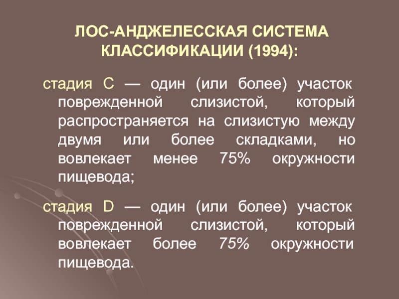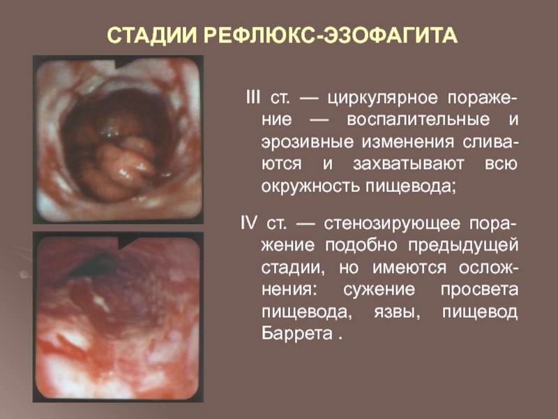 — стенозирующее пора-жение подобно предыдущей стадии, но имеются ослож-нения: сужение просвета пищевода, язвы, пищевод Баррета .