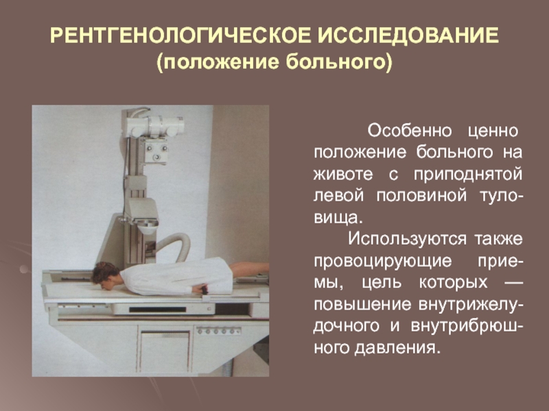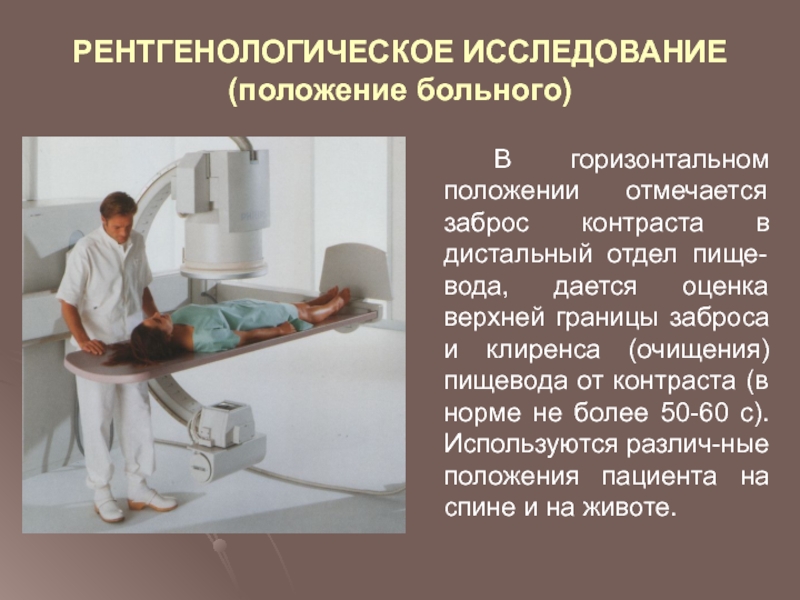 (очищения) пищевода от контраста (в норме не более 50-60 с). Используются различ-ные положения пациента на спине и на животе.