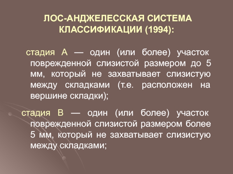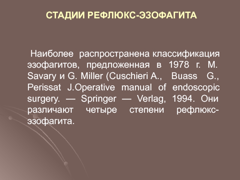 G., Perissat J.Operative manual of endoscopic surgery. — Springer — Verlag, 1994. Они различают четыре степени рефлюкс-эзофагита.