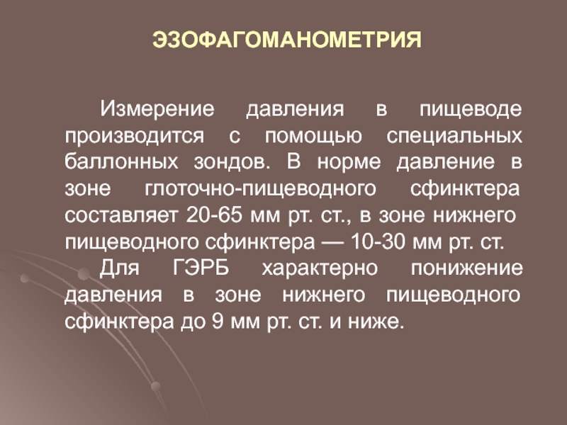 Для ГЭРБ характерно понижение давления в зоне нижнего пищеводного сфинктера до 9 мм рт. ст. и ниже.