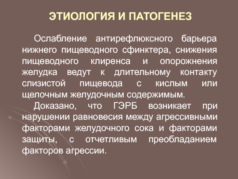 Доказано, что ГЭРБ возникает при нарушении равновесия между агрессивными факторами желудочного сока и факторами защиты, с отчетливым преобладанием факторов агрессии.