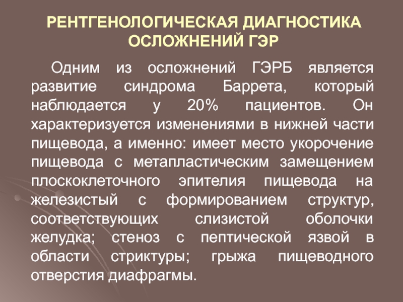 Слайд 40 Одним из осложнений ГЭРБ является развитие синдрома Баррета, который наблюдается