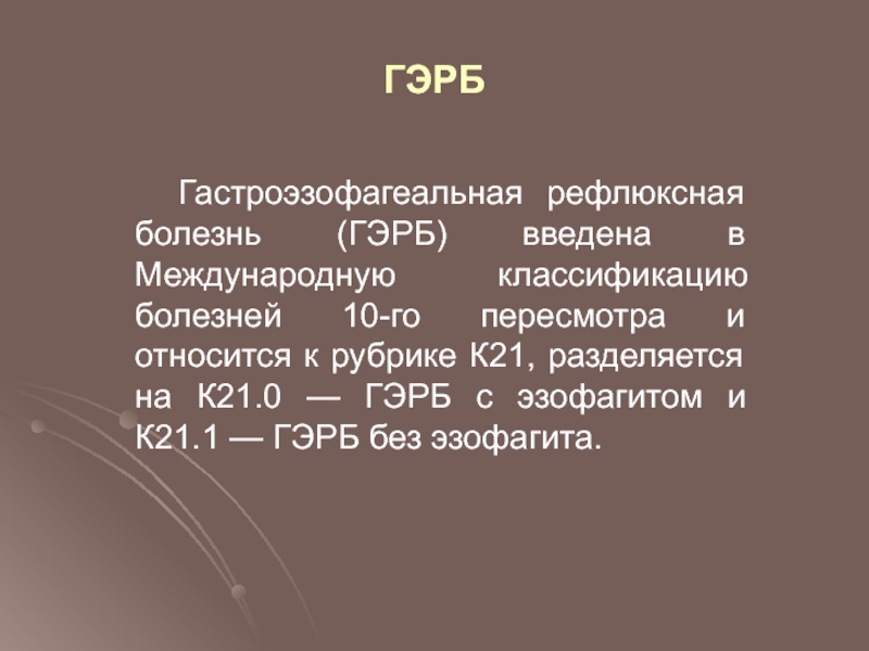 Гастроэзофагеальная рефлюксная болезнь (ГЭРБ) введена в Международную классификацию болезней 10-го