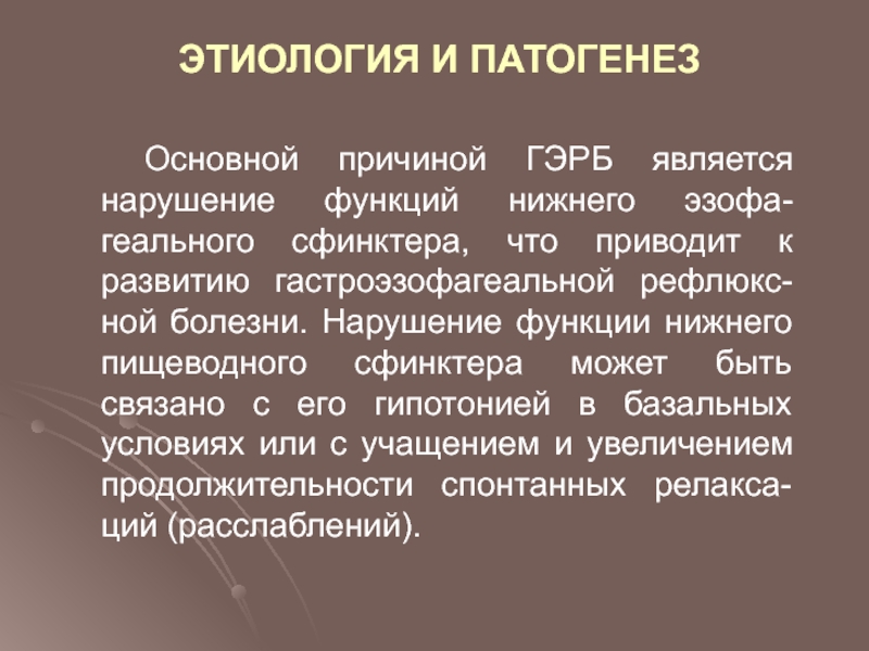Нарушение функции нижнего пищеводного сфинктера может быть связано с его гипотонией в базальных условиях или с учащением и увеличением продолжительности спонтанных релакса-ций (расслаблений).