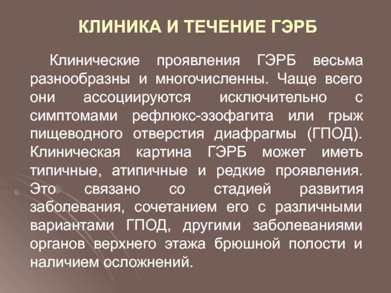 грыж пищеводного отверстия диафрагмы (ГПОД). Клиническая картина ГЭРБ может иметь типичные, атипичные и редкие проявления. Это связано со стадией развития заболевания, сочетанием его с различными вариантами ГПОД, другими заболеваниями органов верхнего этажа брюшной полости и наличием осложнений.