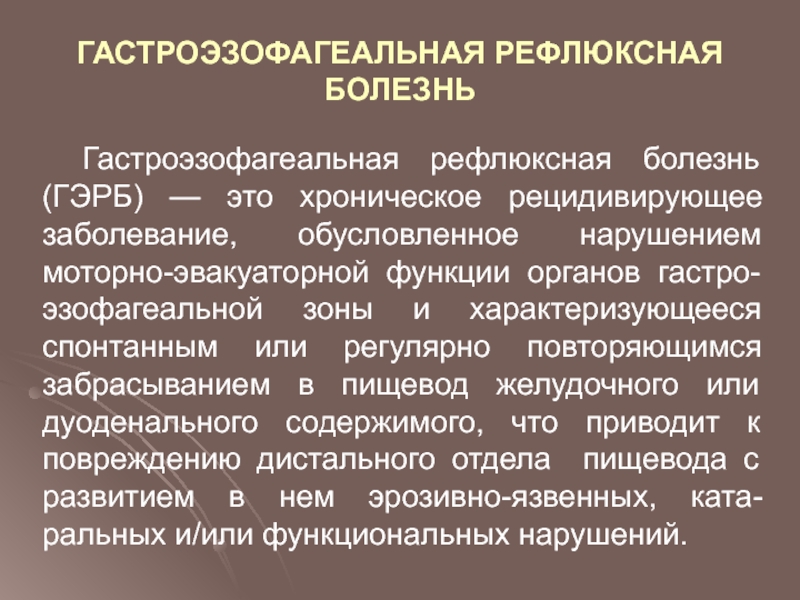 характеризующееся спонтанным или регулярно повторяющимся забрасыванием в пищевод желудочного или дуоденального содержимого, что приводит к повреждению дистального отдела пищевода с развитием в нем эрозивно-язвенных, ката-ральных и/или функциональных нарушений.