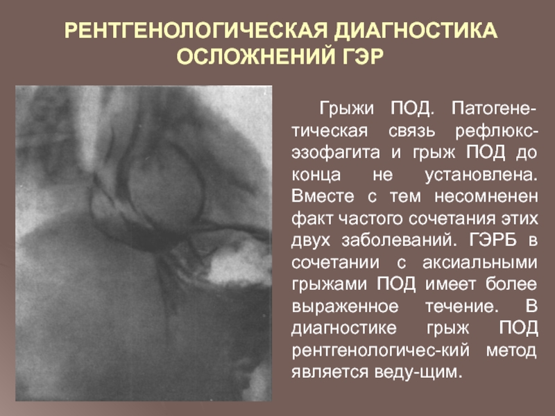 этих двух заболеваний. ГЭРБ в сочетании с аксиальными грыжами ПОД имеет более выраженное течение. В диагностике грыж ПОД рентгенологичес-кий метод является веду-щим.