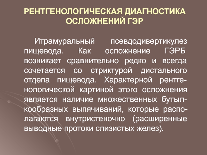 Слайд 42 Итрамуральный псевдодивертикулез пищевода. Как осложнение ГЭРБ возникает сравнительно редко
