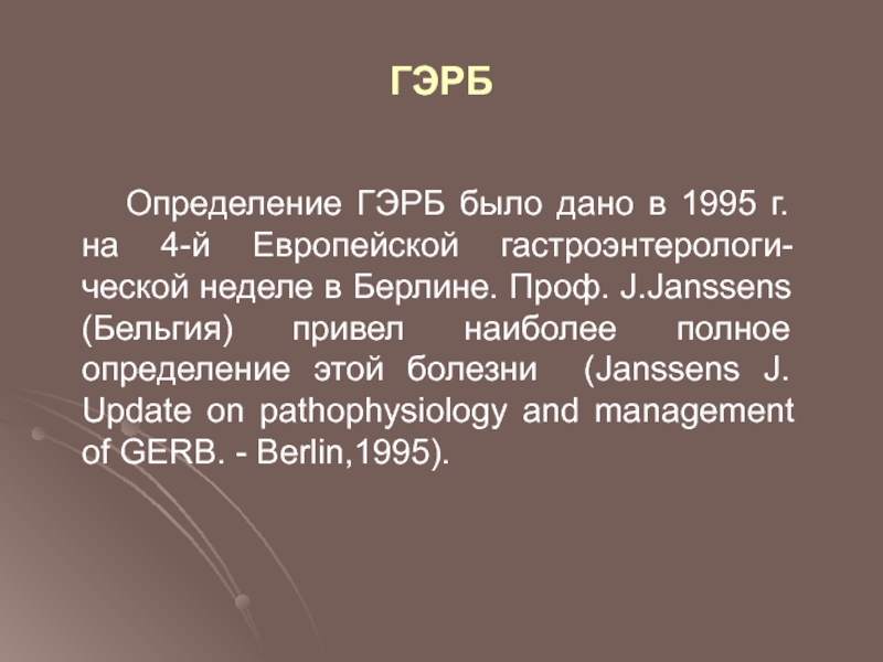 определение этой болезни (Janssens J. Update on pathophysiology and management of GERB. - Berlin,1995).