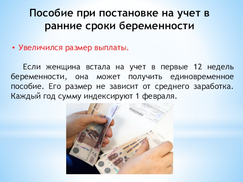 Слайд 6Пособие при постановке на учет в ранние сроки беременности